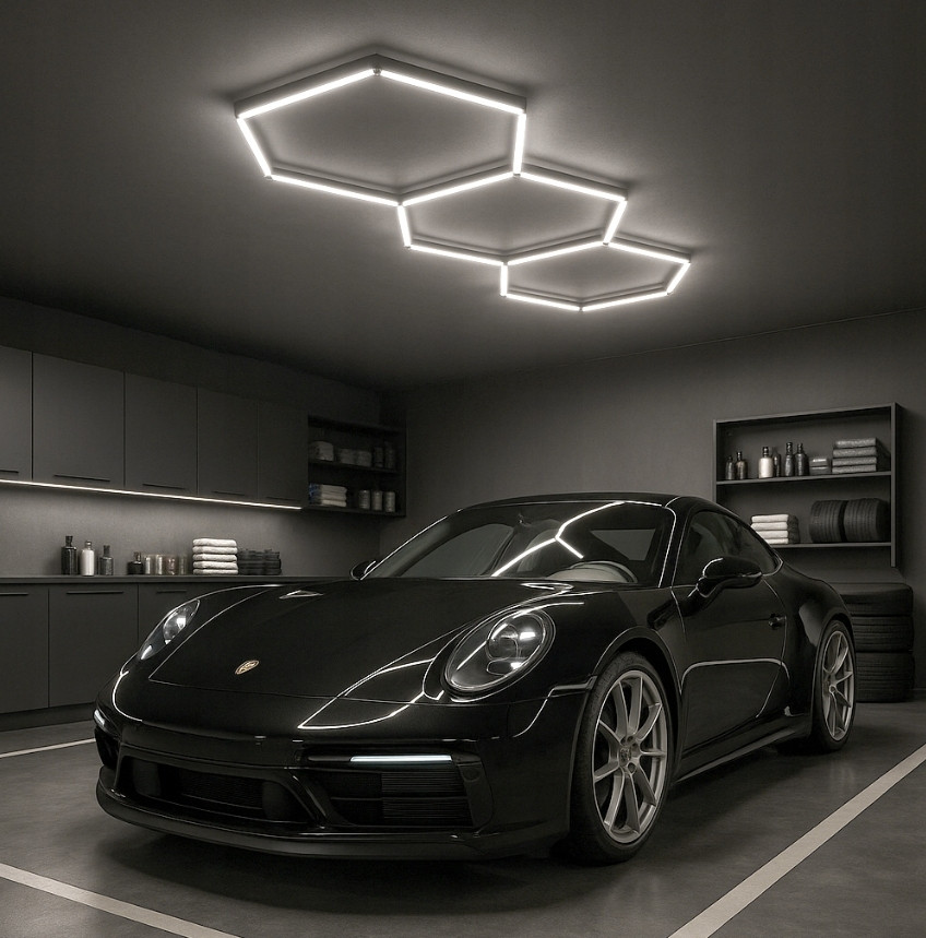 Prémium minőségű HEXAGON LED világítás 128W teljesítménnyel, modern méhsejt kialakítással. Tökéletes választás garázsokba, műhelyekbe, detailing stúdiókba, fitnesztermekbe és minden olyan térbe, ahol fontos a rendkívül erős és egyenletes fény.